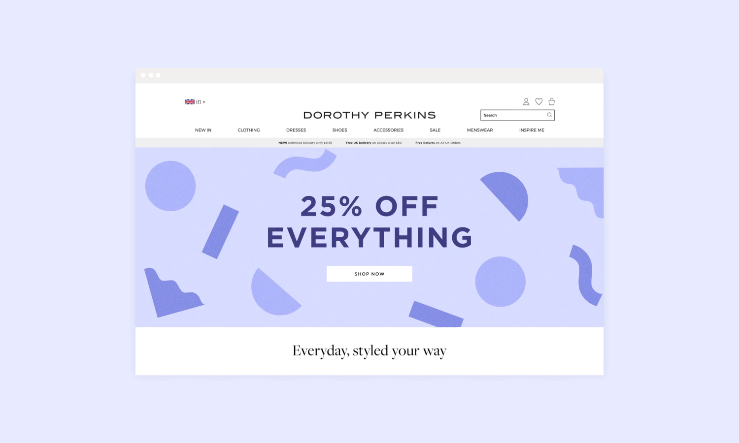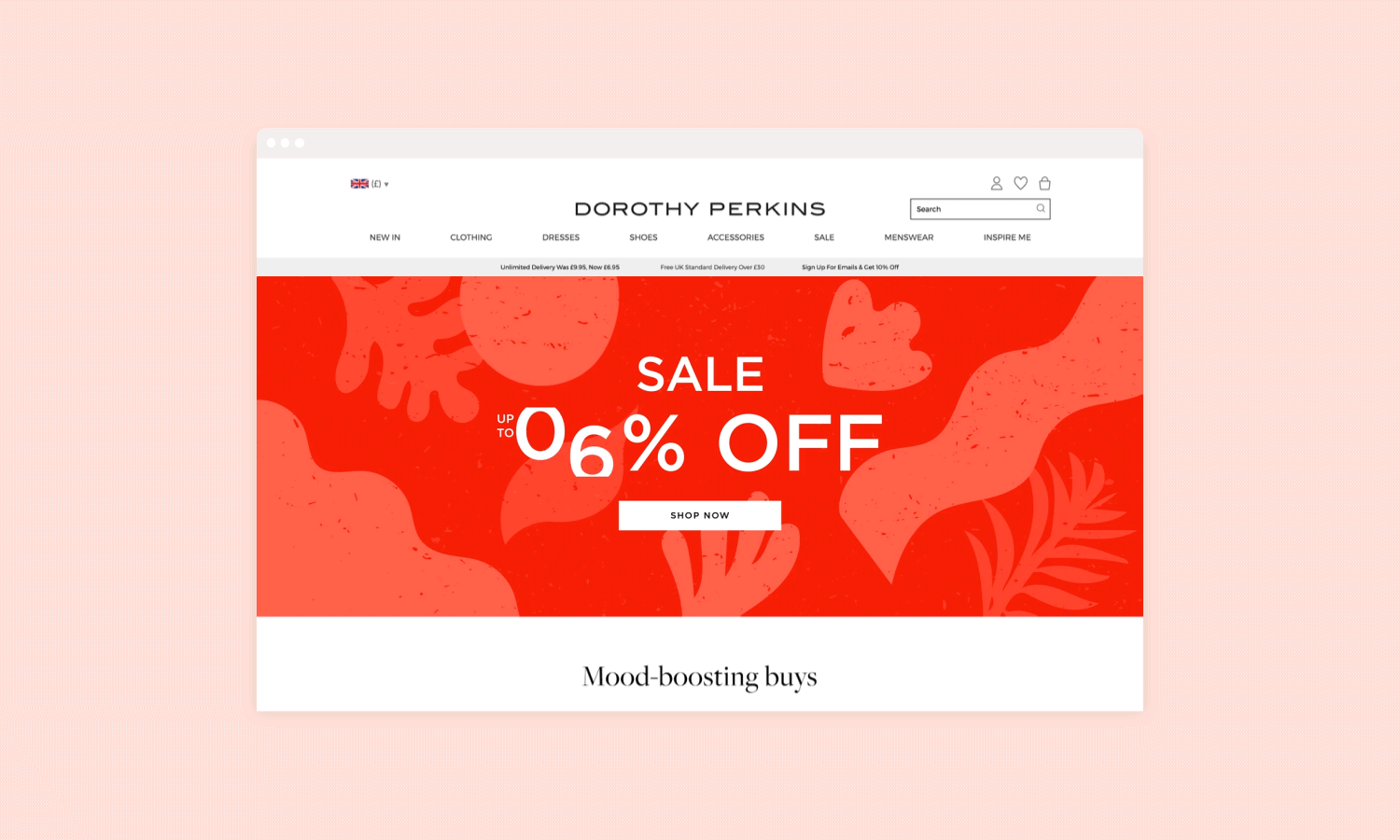Selection of promotions I’ve designed at Arcadia. As brand guardian of Dorothy Perkins, I was responsible for driving the direction for promo creatives and ensuring they were on-brand. Working with the Trade team, and using statistics on customer interaction to create promotions that drove high engagement.