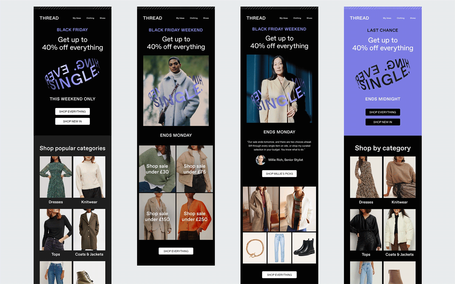 Had ownership over designing the 2021 Black Friday creatives. As it’s the biggest promotion of the year, I challenged myself to explore animation ideas that stood out from our regular promos. I landed on a 3D rotating text animation, which set the visual identity for all creatives. Project required collaborating with the Merchandising, CRM, Content and Styling teams. The emails alone drove +114% sessions to the site.